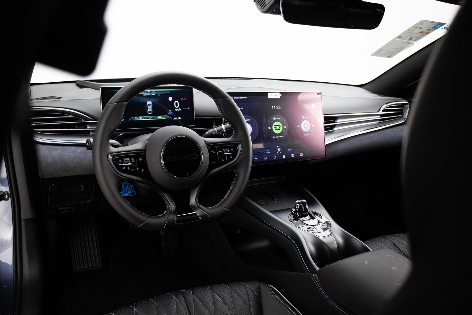 O ar-condicionado de duas zonas é todo controlado pela central multimídia do veículo, incluindo a direção do vento em cada saída de ar. A central, por sua vez, conta com uma super tela de 15,6 polegadas e pode ser mantida na horizontal ou na vertical, como já é de praxe nos carros da BYD. O sistema de som é premium e conta com nada menos que 12 alto-falantes. A conexão com o Android Auto e o Apple CarPlay são sem fio e aceitam comandos de voz, e nessa mesma tela você pode acessar as câmeras 360 graus. O painel de instrumentos tem 10,25 polegadas, duas opções de layout, e completa a riqueza de informações passadas ao motorista.