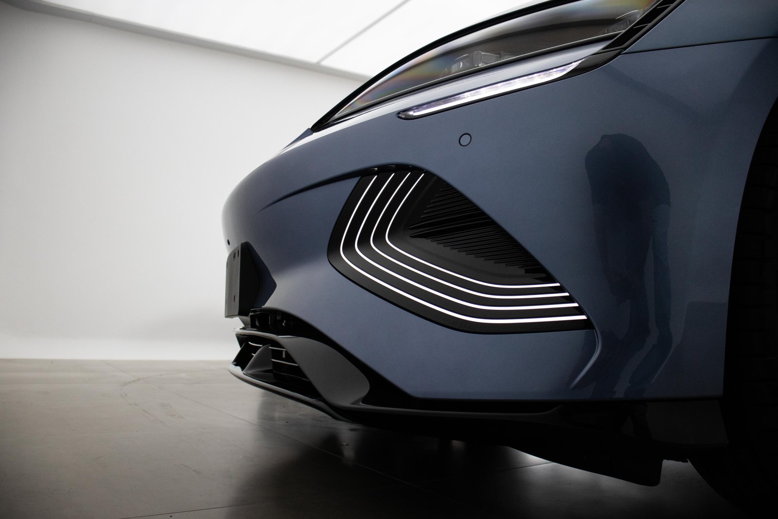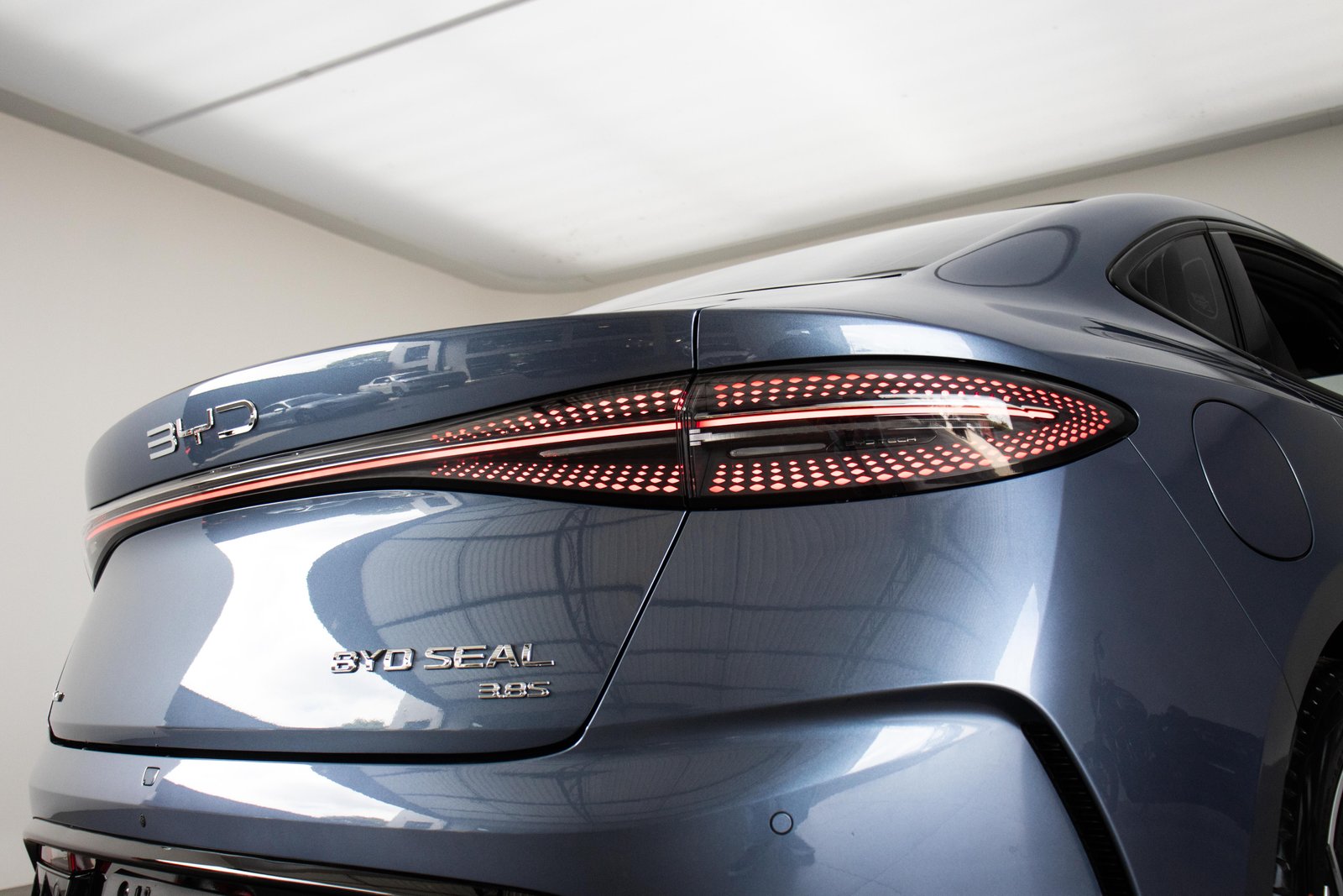 No BYD Seal você vai encontrar faróis full-led com função automática do farol alto, e lá na traseira você se depara com lanternas que são interligadas por um filete de LED. A área acesa é de ponta a ponta.