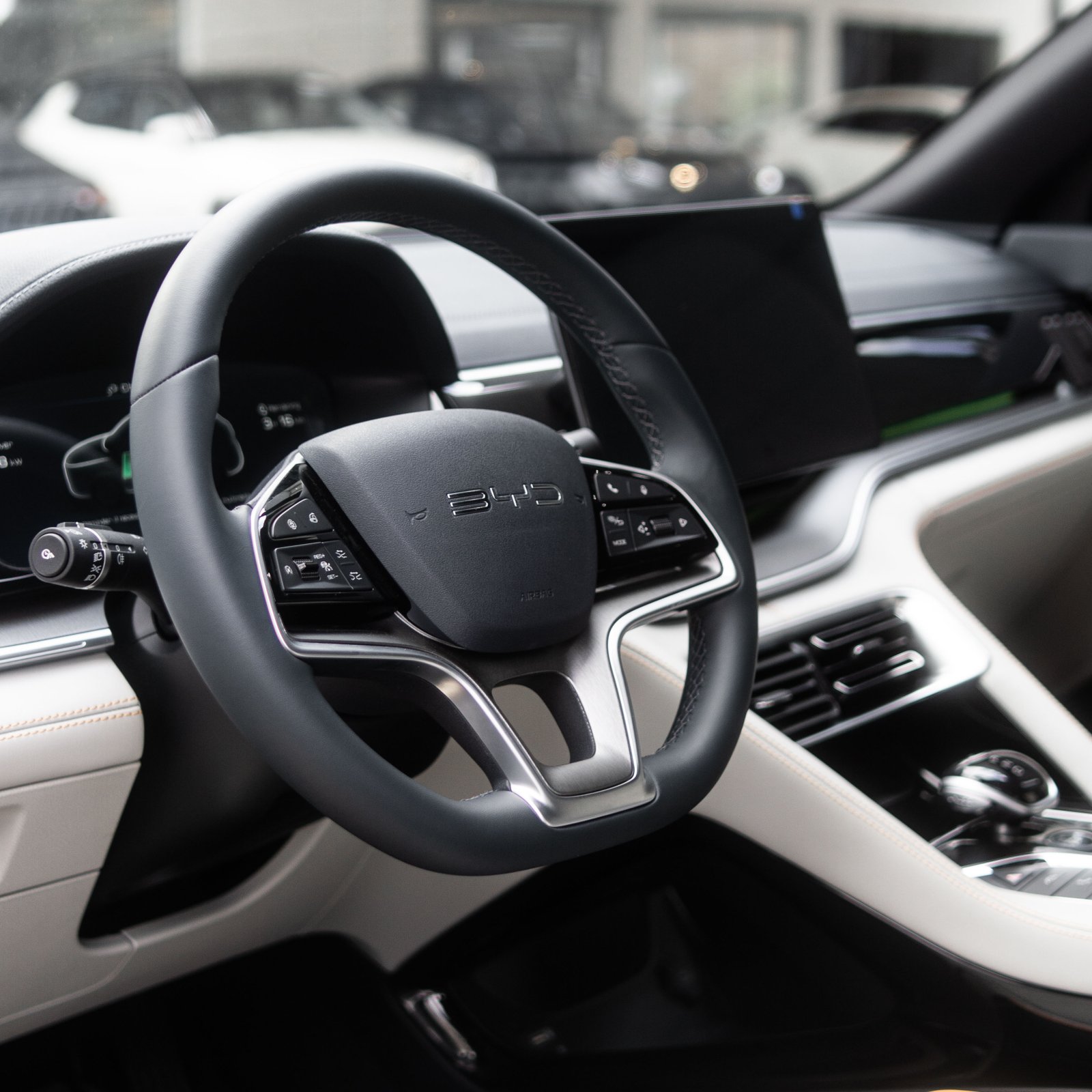 Quem gosta de conforto a bordo precisa conhecer o Song Plus DM-i. O espaço interno é bem amplo e conta com luzes ambiente em LED com 31 opções de cor. O ar-condicionado é digital de duas zonas, o sistema de som é Premium, os bancos dianteiros são elétricos com função de aquecimento e ventilação, e o carregador de celular por indução está presente. A central multimídia de 12,8 polegadas tem uma característica já comum nos carros da BYD, que é a rotação para permanecer na horizontal ou na vertical, a gosto do freguês. Câmeras 360 com imagem HD 3D estão espalhadas pelo carro, além de outros itens de série como piloto automático adaptativo, assistente de permanência em faixa e reconhecimento de sinais de trânsito.