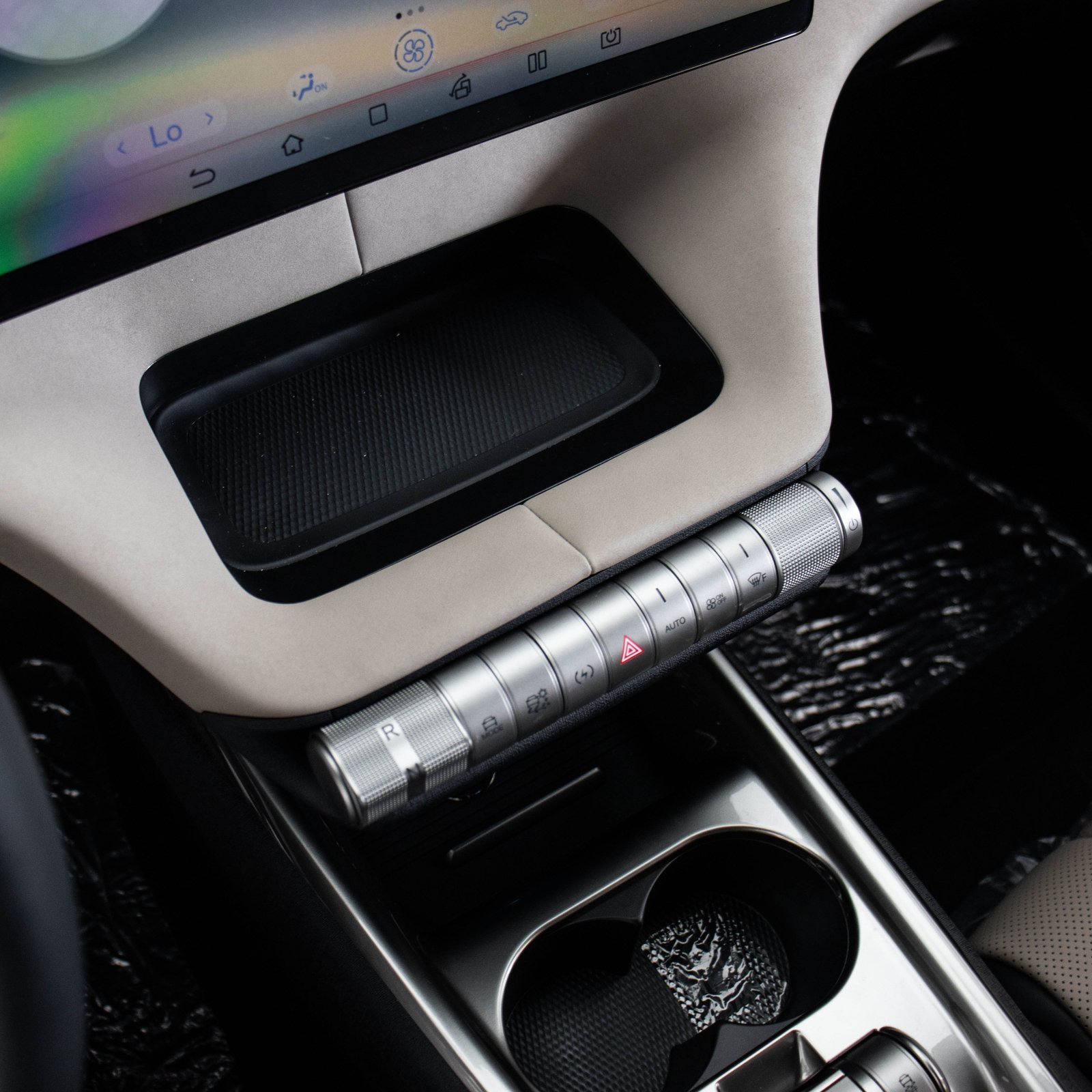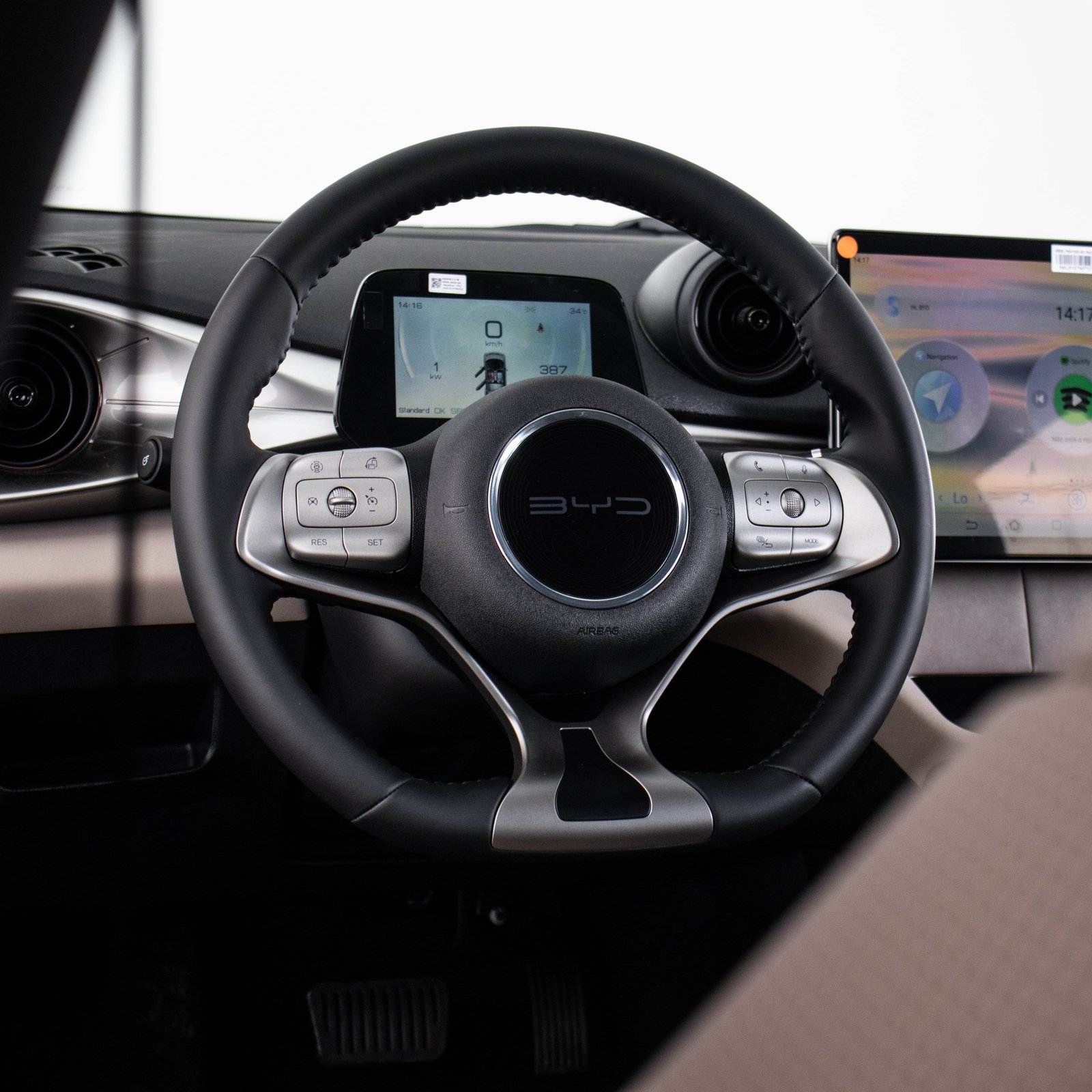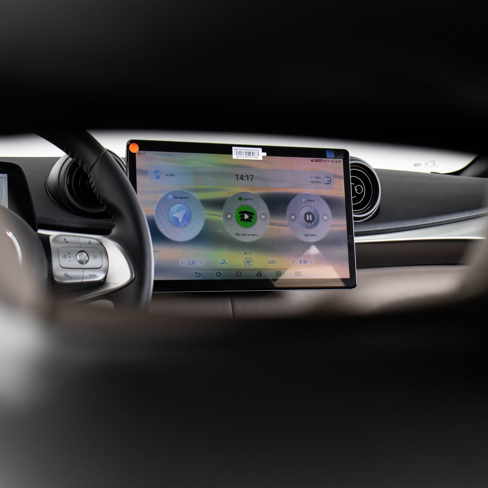 E falando do acabamento interno, vale ressaltar, o Dolphin ganha de lavada de seus concorrentes nessa categoria. Há vários porta objetos espalhados, todos emborrachados. O acabamento das portas e o apoio de braço central são macios, o revestimento dos bancos é muito bonito e imita couro. O painel de instrumentos 100% digital tem riqueza de informações e é um tanto humilde no tamanho, com 5 polegadas. Já a central multimídia em alta definição possui 12,8 polegadas e fica bem destacada no centro do painel. Uma característica da multimídia nos veículos dessa marca é que você pode virar a tela e deixar na vertical, se preferir. Logo abaixo, ficam alguns botões de controle com acabamento que parece aço escovado.