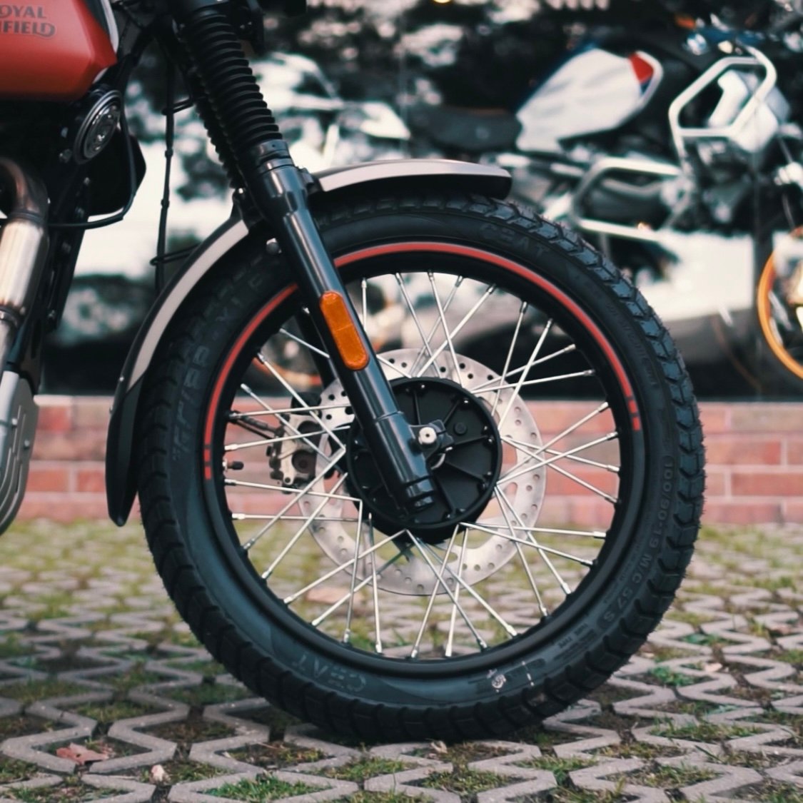 As rodas dianteiras são aro 19 e na traseira são de 17 polegadas, o sistema de freio é o mesmo da Himalayan e possui ABS de série nas duas rodas. A posição de condução não tem novidades, já que o banco da Scram é apenas 5 milímetros mais baixo que o da irmã. Ergonomicamente falando, a Scram tem o guidão e os pedais na mesma posição, além dos equipamentos como o lampejador de farol alto. A suspensão traseira é exatamente a mesma, do tipo com amortecedor único central e 18 centímetros de curso. O tanque de combustível comporta 15 litros e o peso em ordem de marcha, de acordo com a ficha técnica, é de 194 quilos.