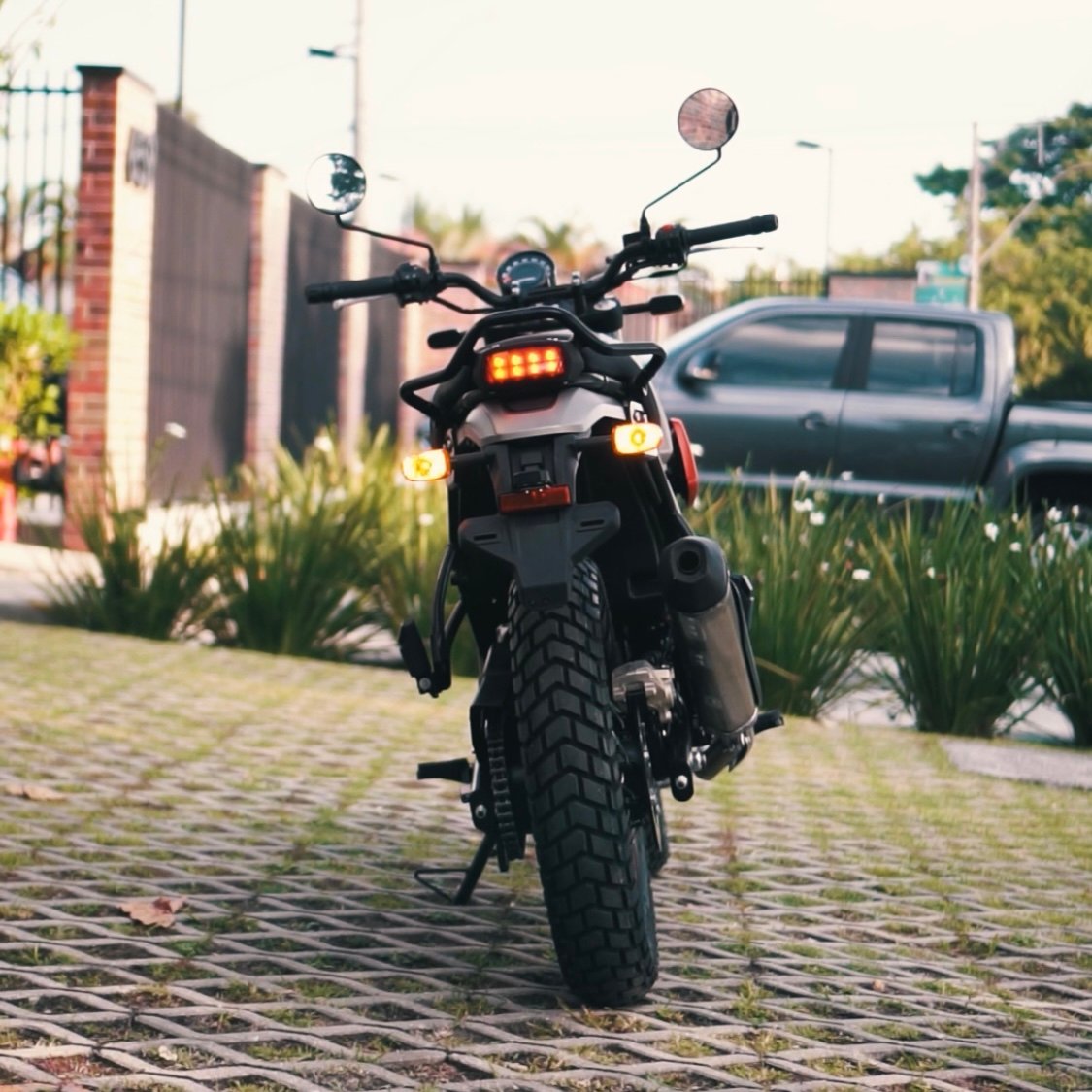 O primeiro contato com a Scram 411 vai te dar a impressão de que ela é muito menor que a Himalayan, mas isso é pela falta das carenagens e ferragens da veterana. Na prática, a falta desses itens e a redução da roda dianteira em duas polegadas deixam a dirigibilidade da moto muito leve para pilotar no dia a dia, graças à melhora no ângulo efetivo de ação que te permite mudar a direção da moto, pra lá e pra cá, com muito mais agilidade. O valor real foi uma perda de apenas 5 quilos frente à Himalayan, mas o ângulo de ação proporcionado pelas rodas 19 polegadas, contra 21, causa a sensação de muito menos peso.