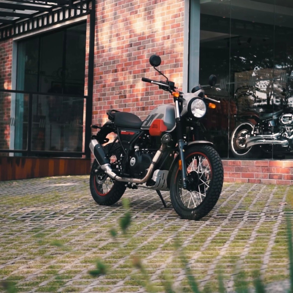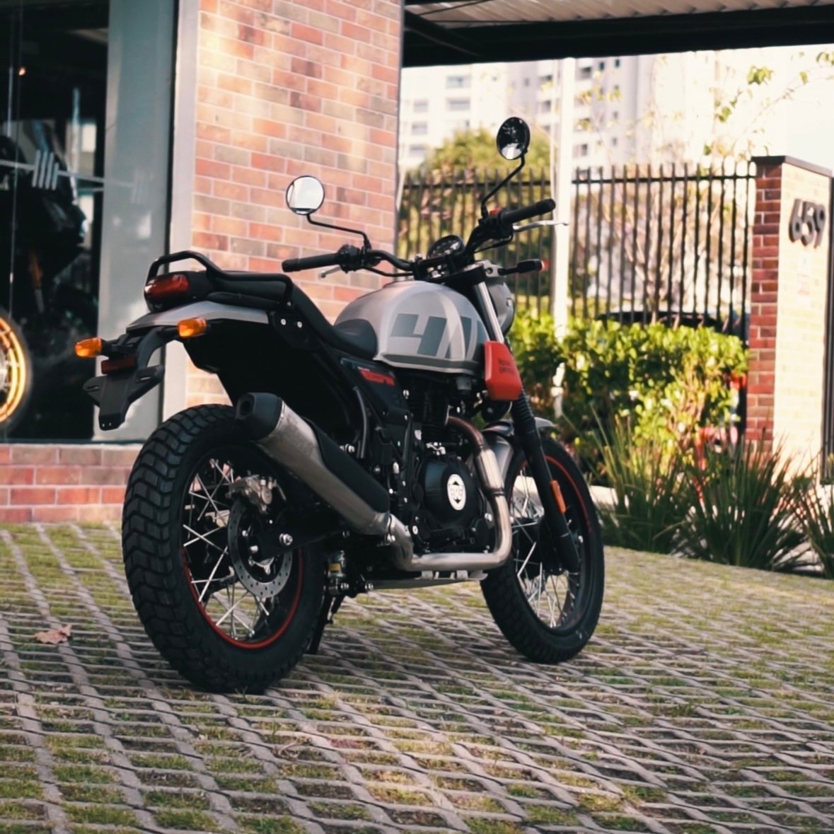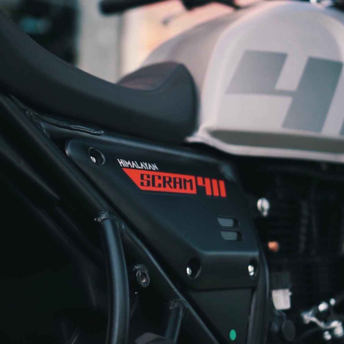 O motor da Scram 411 é o mesmo encontrado na Himalayan, um monocilíndrico de 411 cm³, duas válvulas, comando SOHC e refrigeração a ar. O para-brisa e os protetores de tanque não existem na Scram, diferente da Himalayan, mas ela tem um apelo estético muito interessante, trazendo inclusive detalhes com o logotipo da marca no acabamento do tanque. O apelo estético realmente deu resultado e ficou bonito!